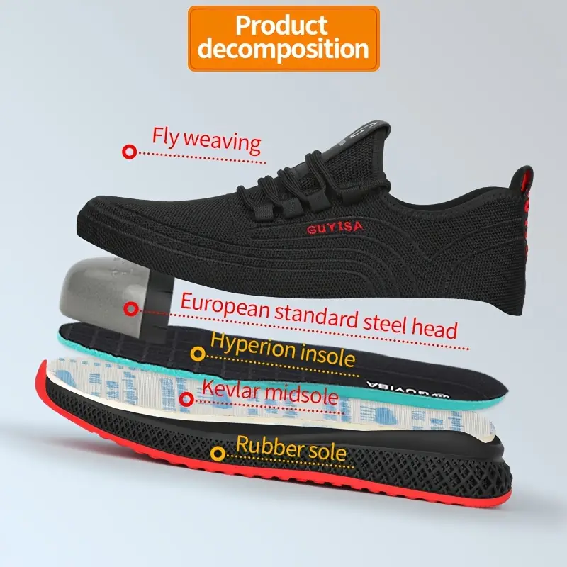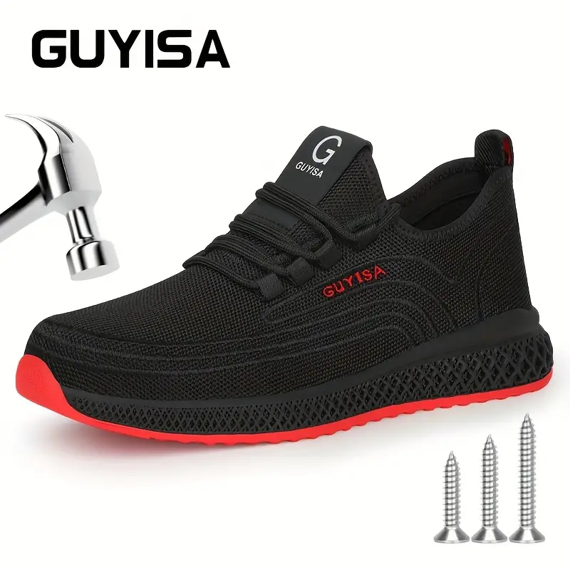 Baskets de sécurité légères GUYISA pour homme – Embout acier, tige en maille respirante et résistante aux perforations, semelle en caoutchouc, noir et rouge, pour le travail, la construction et un confort optimal tout au long de la journée