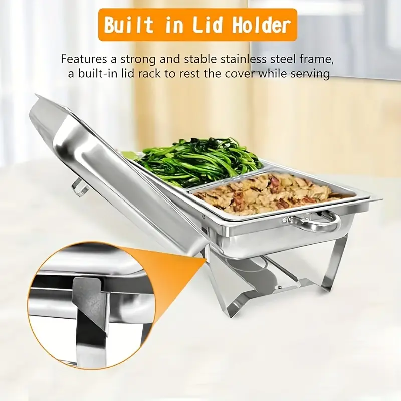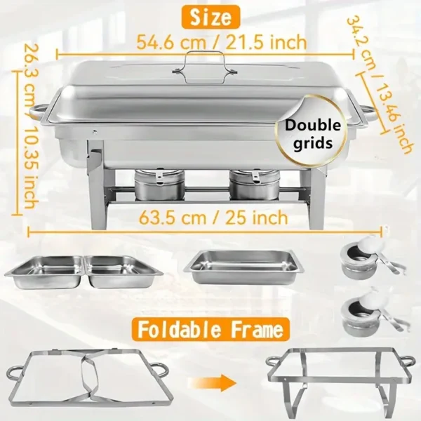 Ensemble de plats à réchaud en acier inoxydable avec 2 compartiments, Réchaud de buffet rectangulaire argenté de taille standard avec plateaux, couvercle de casserole et support pliable pour fêtes, mariages, banquets