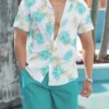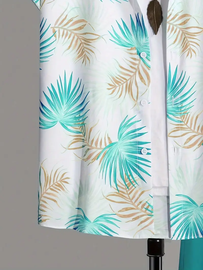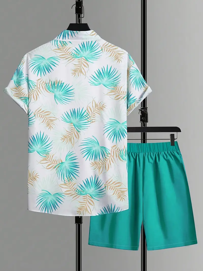 Tenue pour homme, ensemble décontracté à imprimé feuilles, chemise boutonnée à manches courtes et short, 2 pièces, pour activités de plein air en été